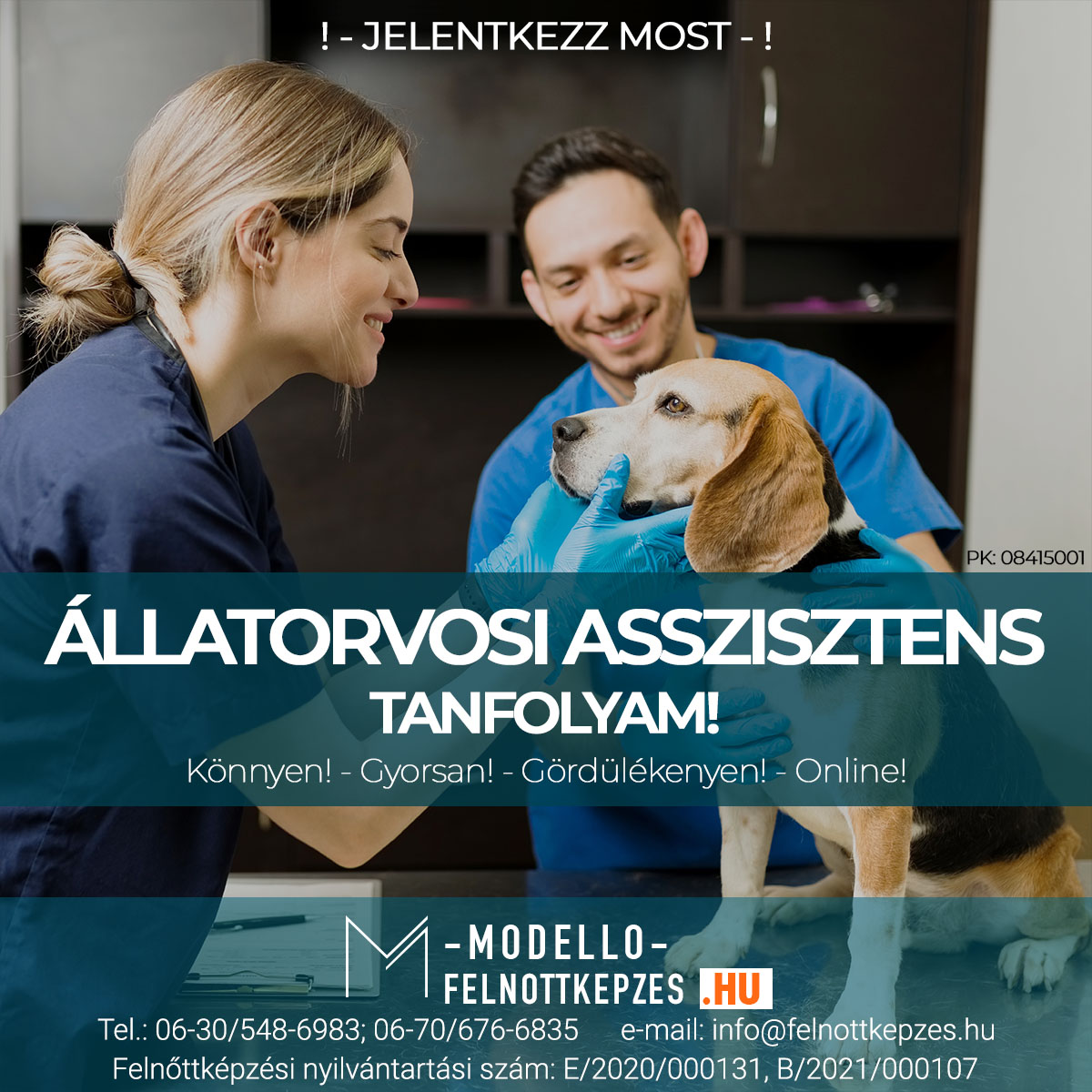 Az állatorvosi asszisztens (PK.:08415001) képzésünk egyedülálló lehetőséget kínál mindazok számára, akik szeretnék elmélyíteni tudásukat az állategészségügy területén, és hozzájárulni az állatok jólétéhez és gyógyulásához. Tanfolyamunk nem csupán a hagyományos ismereteket nyújtja, hanem a legújabb technikák és eljárások elsajátítását is biztosítja, így a résztvevők modern tudással felvértezve kezdik meg karrierjüket.